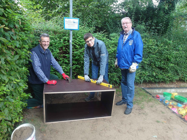 Im Sommer 2014 hatte der Bürgerverein Unterfeldhaus-AKTIV auf dem städtischen Spielplatz an der Neuenhausstraße die erste Box für die Aufbewahrung von Sandspielzeug eingerichtet. Die Idee, auf diese Weise Kindern und Eltern das Spielplatz-Dasein zu erleichtern, hatte Vereinsmitglied Horst Feldmann. Obwohl seine eigenen Kinder dem Sandkastenspiel entwachsen waren, konnte er sich noch gut an das manchmal umständliche Hin- und Her mit Eimerchen, Sieb und Schaufel erinnern. Die Möglichkeit, diese vor Ort deponieren zu können, kam bei den jungen Familien im Umkreis so gut an, dass der Bürgerverein nach und nach auch auf anderen Spielplätzen im Stadtteil eine solche Box installierte. Mit dem notwenigen Spielzeug füllten sie sich beinahe wie von selbst. Nicht nur mit vergessenen Teilen. Viele Familien spendeten gern, womit ihre älter gewordenen Kinder nicht mehr spielten. Die intensive Nutzung hinterließ im Laufe der Jahre aber auch Spuren. Beschädigungen mussten repariert, manchmal die ganze Box ersetzt werden. Aufsicht und Pflege hielten das Boxenteam des Bürgervereins im Einsatz. „Nachdem der Zahn der Zeit - und gelegentlich leider auch Vandalismus - den eigentlich widerstandsfähigen Kunststoff-Boxen immer mehr zusetzte, fassten wir den Beschluss, sie komplett durch noch stabilere Exemplare aus wetterfestem Holz zu ersetzen“, erklärte Pressesprecherin Heide Horn. „Und zwar bewusst ohne Deckel“, betonte nach gewonnener Erfahrung Teamchef Horst Feldmann. Bei den Deckeln seien die meisten Beschädigungen entstanden. Zudem würde in der offenen Box jetzt das Spielzeug durch Regen natürlich gereinigt. „Und damit es aber nicht im Wasser schwimmt, ist auch der Boden weggelassen worden“, begründete er überzeugend die Entscheidung für Boxen ohne Deckel und Boden. Tatkräftig unterstützt wurde das „Boxenteam“ bei dieser Aktion durch Horst Feldmanns Sohn Erik, mit dessen Sandspielzeug vor Jahren die erste Box befüllt worden war. Angetan von dem Projekt zeigte sich auch Irina Meier von der Kreissparkasse Düsseldorf, mit deren Zuwendung aus der PS-Ausschüttung der Bürgerverein Unterfeldhaus-AKTIV die Anschaffung der Boxen finanziert hat. Bei ihrem Besuch jetzt auf dem Spielplatz am Thieleshof ließ sie es sich nicht nehmen, beim Aufbau der letzten Box mit anzupacken und beim Spielzeugsortieren zu helfen.